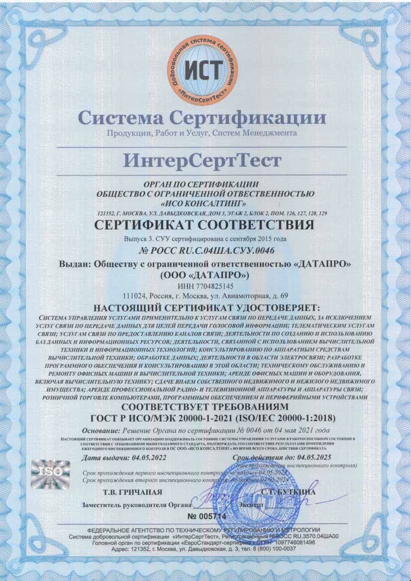Сертификат ГОСТ Р ИСО/МЭК 20000-1-2021 (ISO/IEC 20000-1:2018).