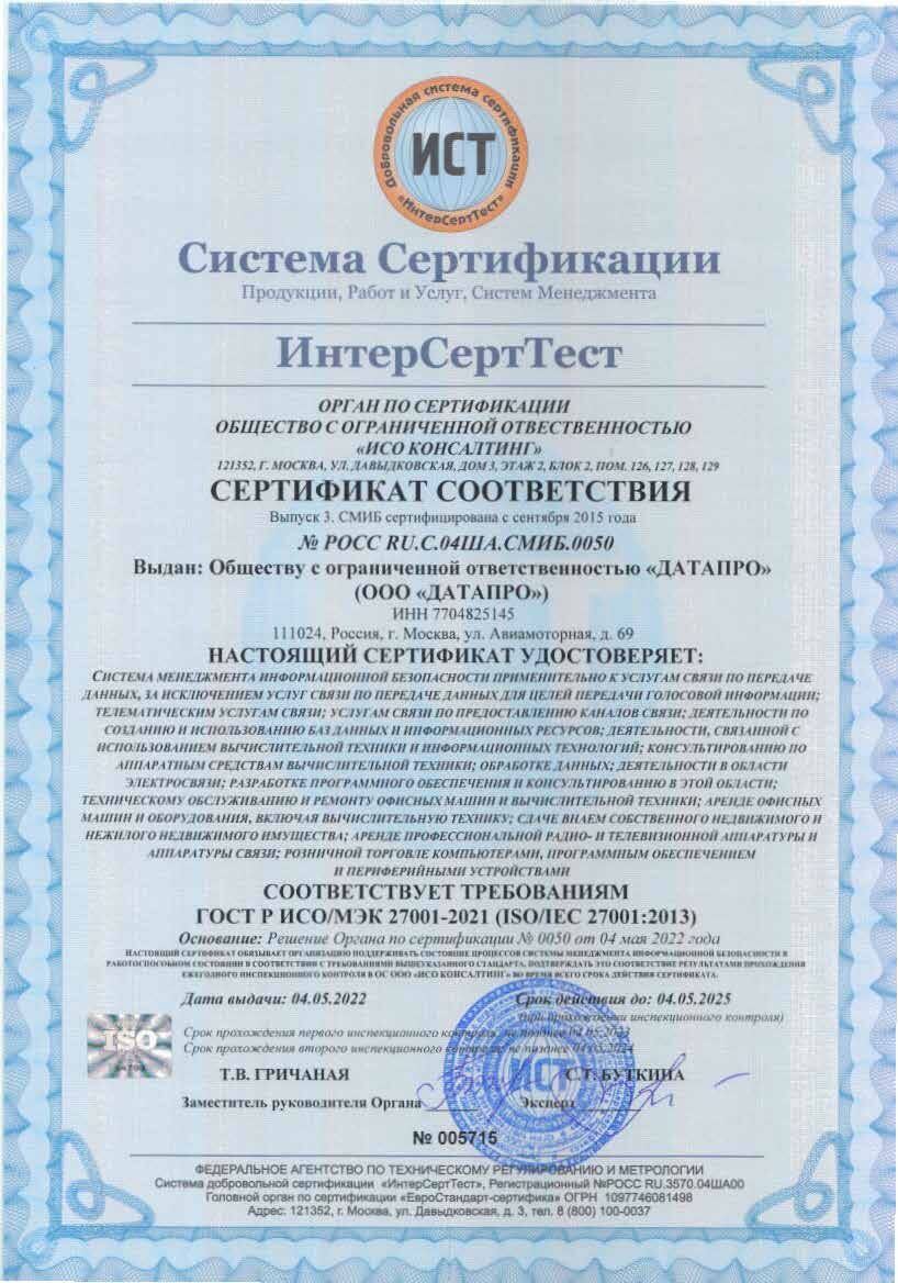 Сертификат ГОСТ Р ИСО/МЭК 27001-2021 (ISO/IEC 27001:2013).