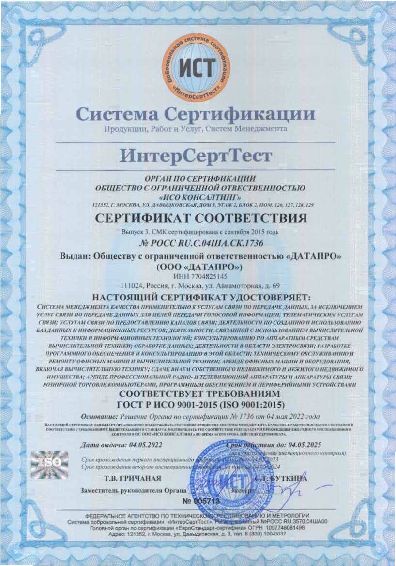 Сертификат ГОСТ ISO 9001-2015 (ISO 9001:2015).